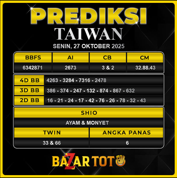Prediksi TAIWAN Hari Ini BAZARTOTO – Togel TAIWAN Tutup jam 20:30 dan Pengumuman Keluaran jam 20:45.
