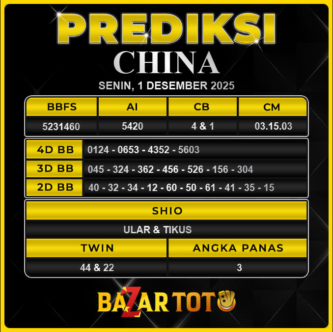 Prediksi CHINA Hari Ini BAZARTOTO – Togel CHINA Tutup jam 13:30 dan Pengumuman Keluaran jam 13:50.
