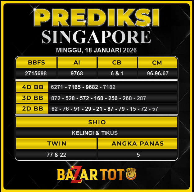 Prediksi SINGAPORE Hari Ini BAZARTOTO – Togel SINGAPORE Tutup jam 20:30 dan Pengumuman Keluaran jam 20:45.