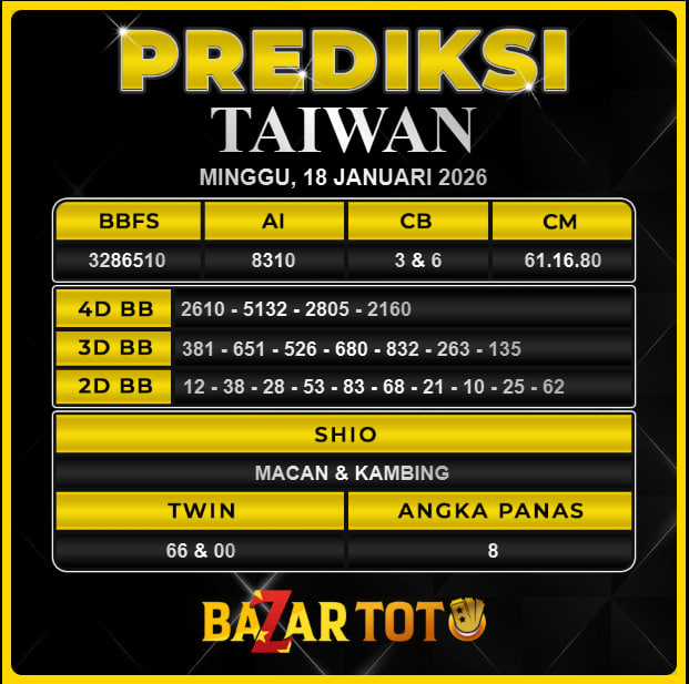 Prediksi TAIWAN Hari Ini BAZARTOTO – Togel TAIWAN Tutup jam 20:30 dan Pengumuman Keluaran jam 20:45