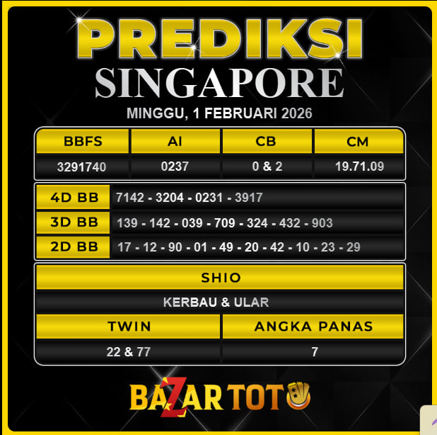 Prediksi SINGAPORE Hari Ini BAZARTOTO – Togel SINGAPORE Tutup jam 20:30 dan Pengumuman Keluaran jam 20:45.