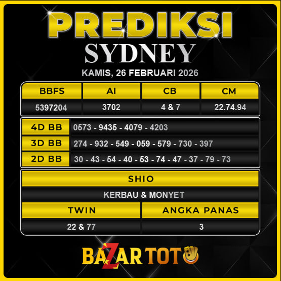 Prediksi SYDNEY Hari Ini BAZARTOTO – Togel SYDNEY Tutup jam 11:30 dan Pengumuman Keluaran jam 11:50.