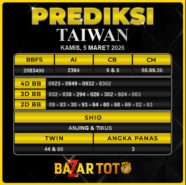 Prediksi TAIWAN Hari Ini BAZARTOTO – Togel TAIWAN Tutup jam 20:30 dan Pengumuman Keluaran jam 20:45