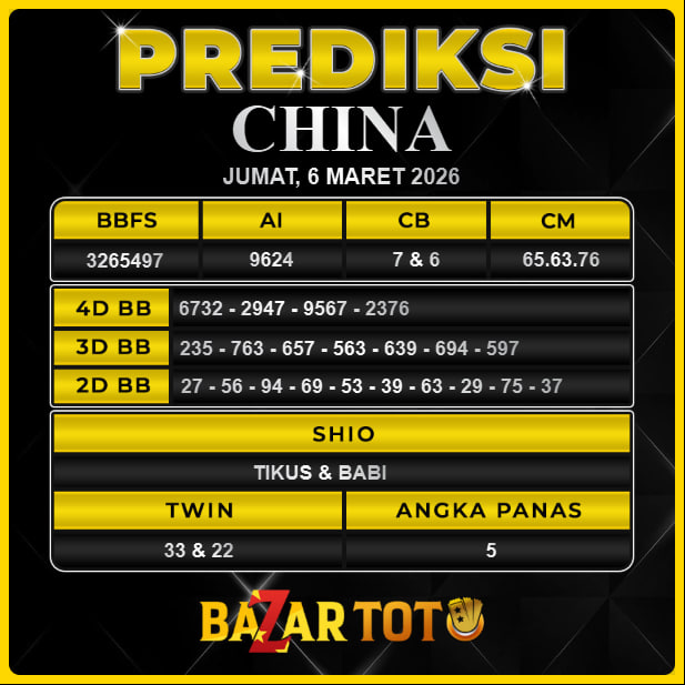Prediksi CHINA Hari Ini BAZARTOTO – Togel CHINA Tutup jam 13:30 dan Pengumuman Keluaran jam 13:50.