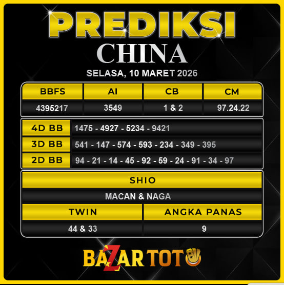 Prediksi CHINA Hari Ini BAZARTOTO – Togel CHINA Tutup jam 13:30 dan Pengumuman Keluaran jam 13:50.