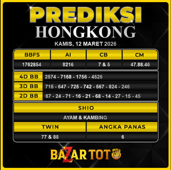 Prediksi HONGKONG Hari Ini BAZARTOTO – Togel HONGKONG Tutup jam 22:40 dan Pengumuman Keluaran jam 23:00.