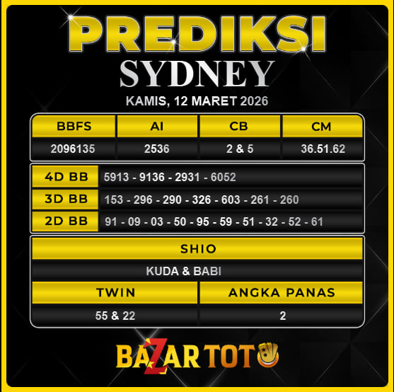 Prediksi SYDNEY Hari Ini BAZARTOTO – Togel SYDNEY Tutup jam 11:30 dan Pengumuman Keluaran jam 11:50.