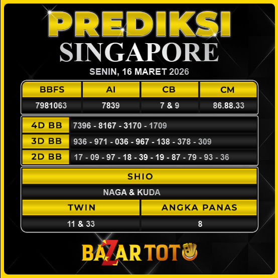 Prediksi SINGAPORE Hari Ini BAZARTOTO – Togel SINGAPORE Tutup jam 20:30 dan Pengumuman Keluaran jam 20:45.