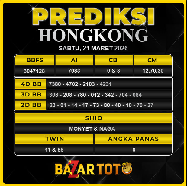 Prediksi HONGKONG Hari Ini BAZARTOTO – Togel HONGKONG Tutup jam 22:40 dan Pengumuman Keluaran jam 23:00.