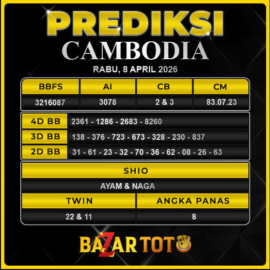 Prediksi CAMBODIA Hari Ini BAZARTOTO – Togel CAMBODIA Tutup jam 11:30 dan Pengumuman Keluaran jam 11:50.