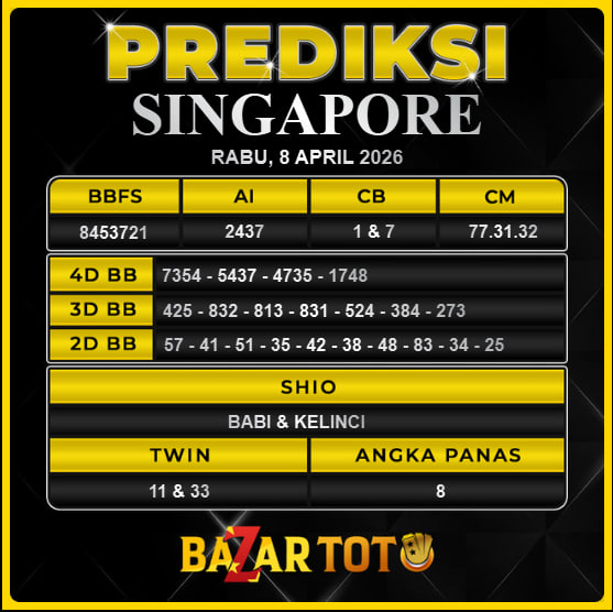 Prediksi SINGAPORE Hari Ini BAZARTOTO – Togel SINGAPORE Tutup jam 20:30 dan Pengumuman Keluaran jam 20:45.