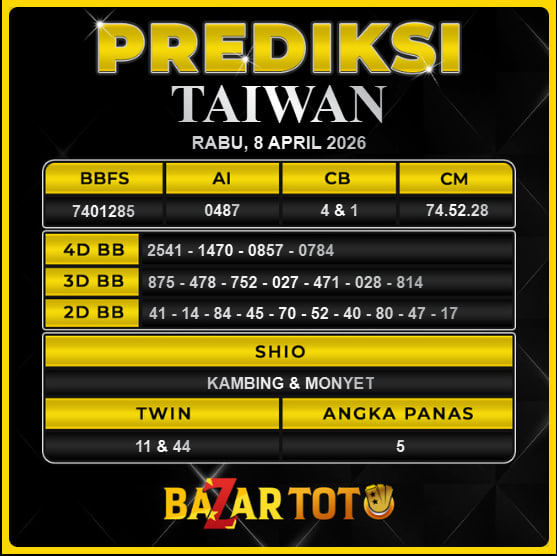 Prediksi TAIWAN Hari Ini BAZARTOTO – Togel TAIWAN Tutup jam 20:30 dan Pengumuman Keluaran jam 20:45