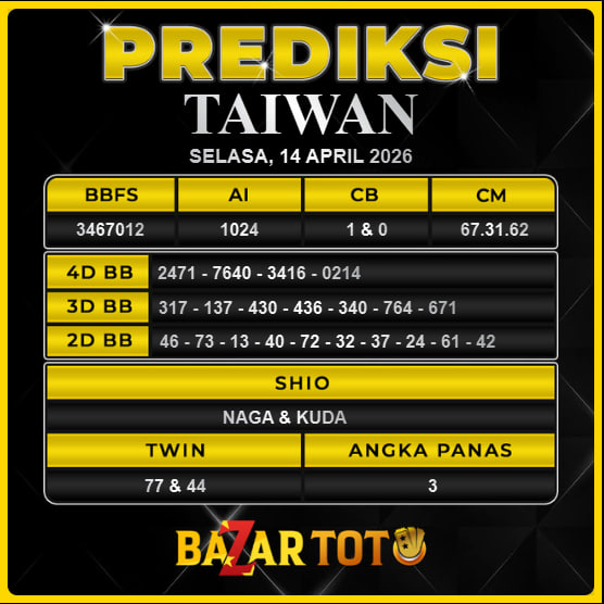 Prediksi TAIWAN Hari Ini BAZARTOTO – Togel TAIWAN Tutup jam 20:30 dan Pengumuman Keluaran jam 20:45