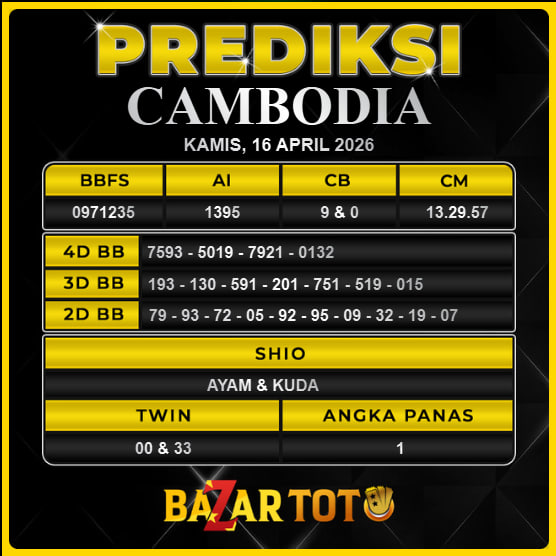 Prediksi CAMBODIA Hari Ini BAZARTOTO – Togel CAMBODIA Tutup jam 11:30 dan Pengumuman Keluaran jam 11:50.