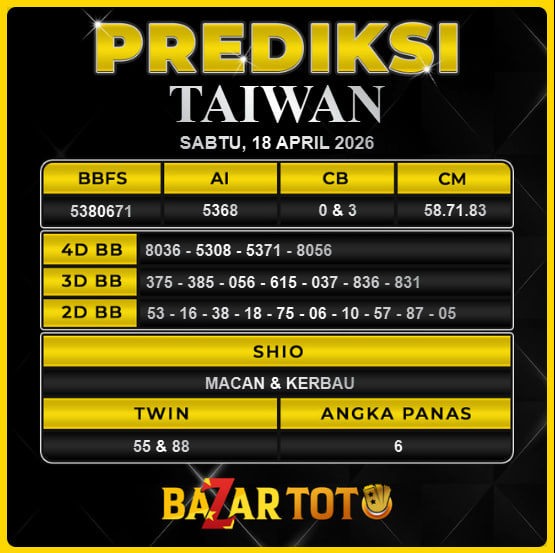 Prediksi TAIWAN Hari Ini BAZARTOTO – Togel TAIWAN Tutup jam 20:30 dan Pengumuman Keluaran jam 20:45